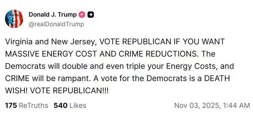 به گزارش نیمروز 24؛ ترامپ در پستی چنین نوشته است؛ ویرجینیا و نیوجرسی، اگر میخواهید هزینههای انرژی و جرم و جنایت به شدت کاهش یابد، به جمهوریخواهان رأی دهید.