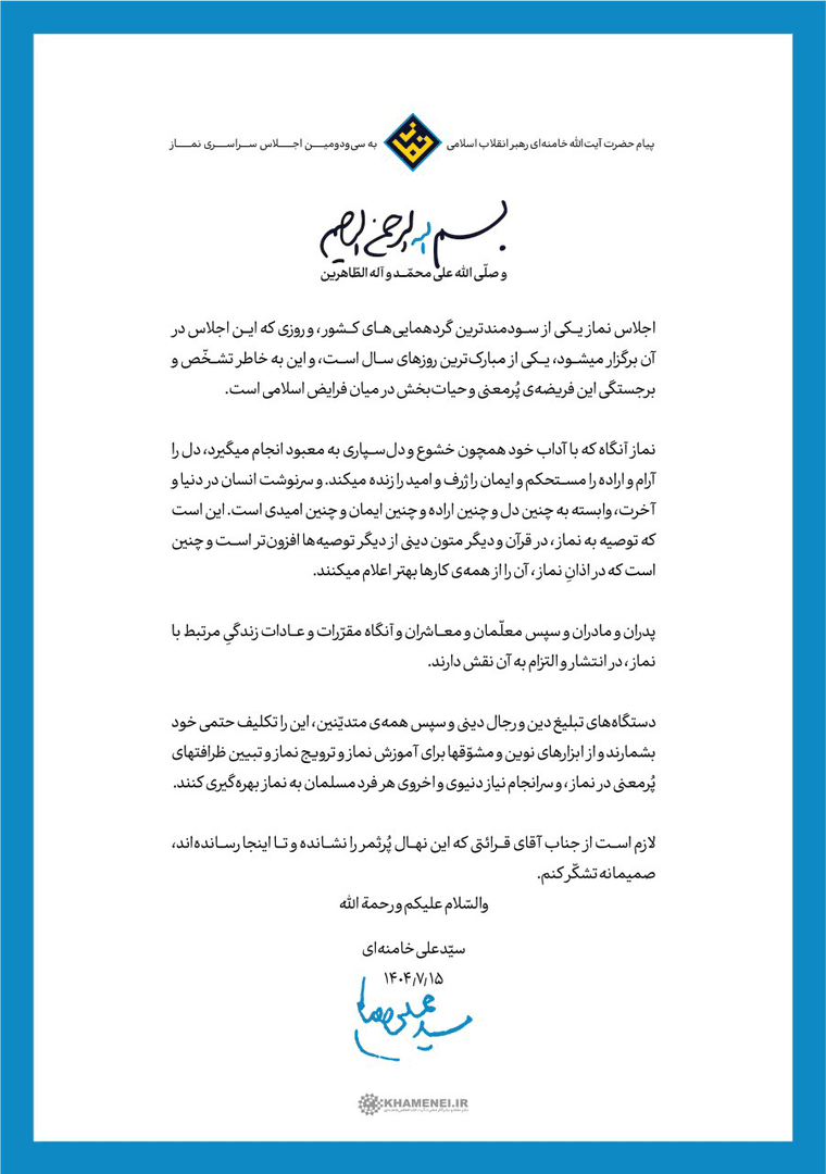 لازم است از جناب آقای قرائتی که این نهال پُرثمر را نشانده و تا اینجا رساندهاند، صمیمانه تشکّر کنم. والسّلام علیکم و رحمة الله سیّدعلی خامنهای۱۴۰۴/۷/۱۵