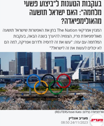 در همان برهه، مجله آمریکایی «دِ نیشین» (The Nation) احتمال تعلیق رژیم صهیونیستی از بازیهای المپیک پاریس را بررسی کرده و نوشتهبود: «آنها این کار را با روسیه و آفریقای جنوبی کردند، چرا نمیتوانند با رژیم صهیونیستی این کار را انجام دهند؟»