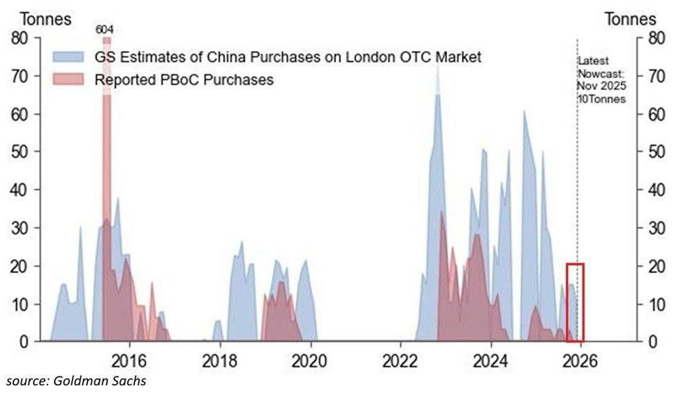 بر اساس برآوردهای گلدمن ساکس، چین در ماه نوامبر بیش از ۱۰ تن طلا خریداری کرده است که این مقدار تقریباً ۱۱ برابر بیشتر از آن چیزی است که بهطور رسمی توسط بانک مرکزی چین اعلام شده است، همچنین در سپتامبر، خریدهای چین به بیش از ۱۵ تن رسیده که ۱۰ برابر بیشتر از گزارشهای رسمی بوده است، این میزان خرید بهطور غیررسمی به یکی از محرکهای اصلی افزایش قیمت طلا در بازار جهانی تبدیل شده است.